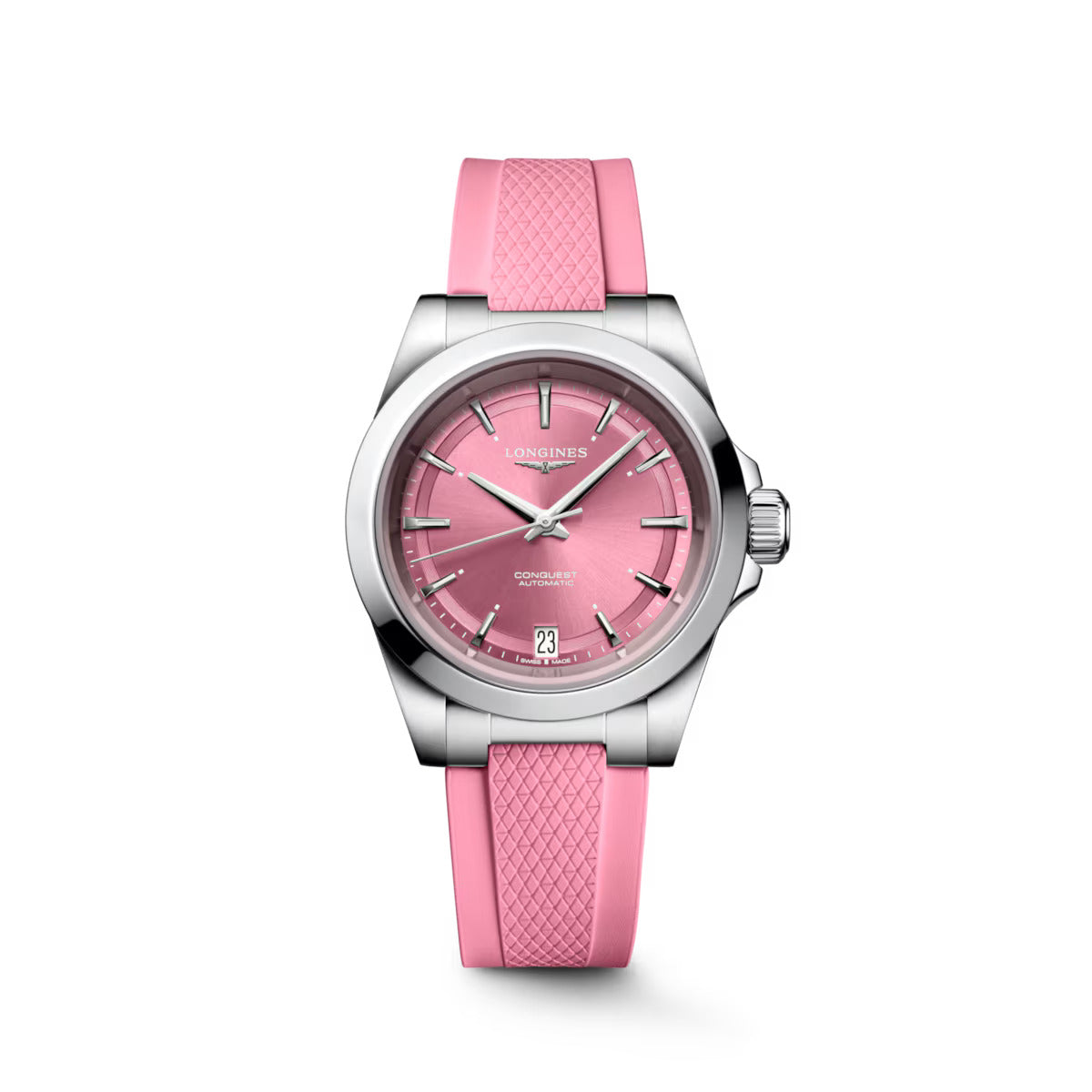 This new Conquest is driven by an exclusive Longines self-winding mechanical movement. Presented in a 34 mm steel case water-resistant up to 10 bar (100 m), it features a snailed pink sunray dial with rhodium-plated hands and applied rhodium-plated hour markers with Super-LumiNova® treatment. The date aperture is at 6 o’clock. The watch comes with a pink rubber strap.