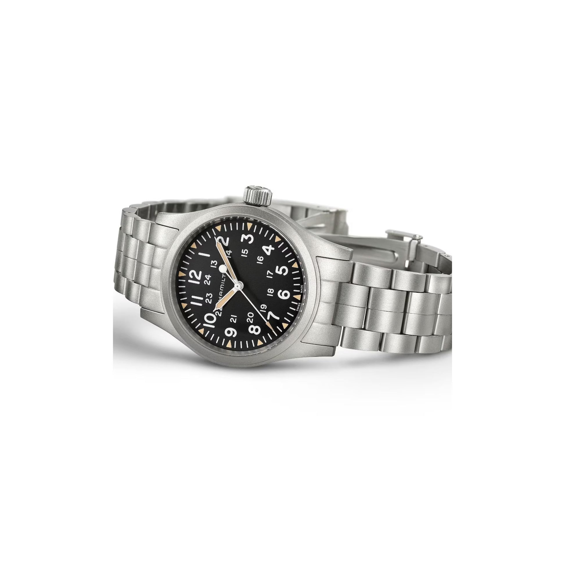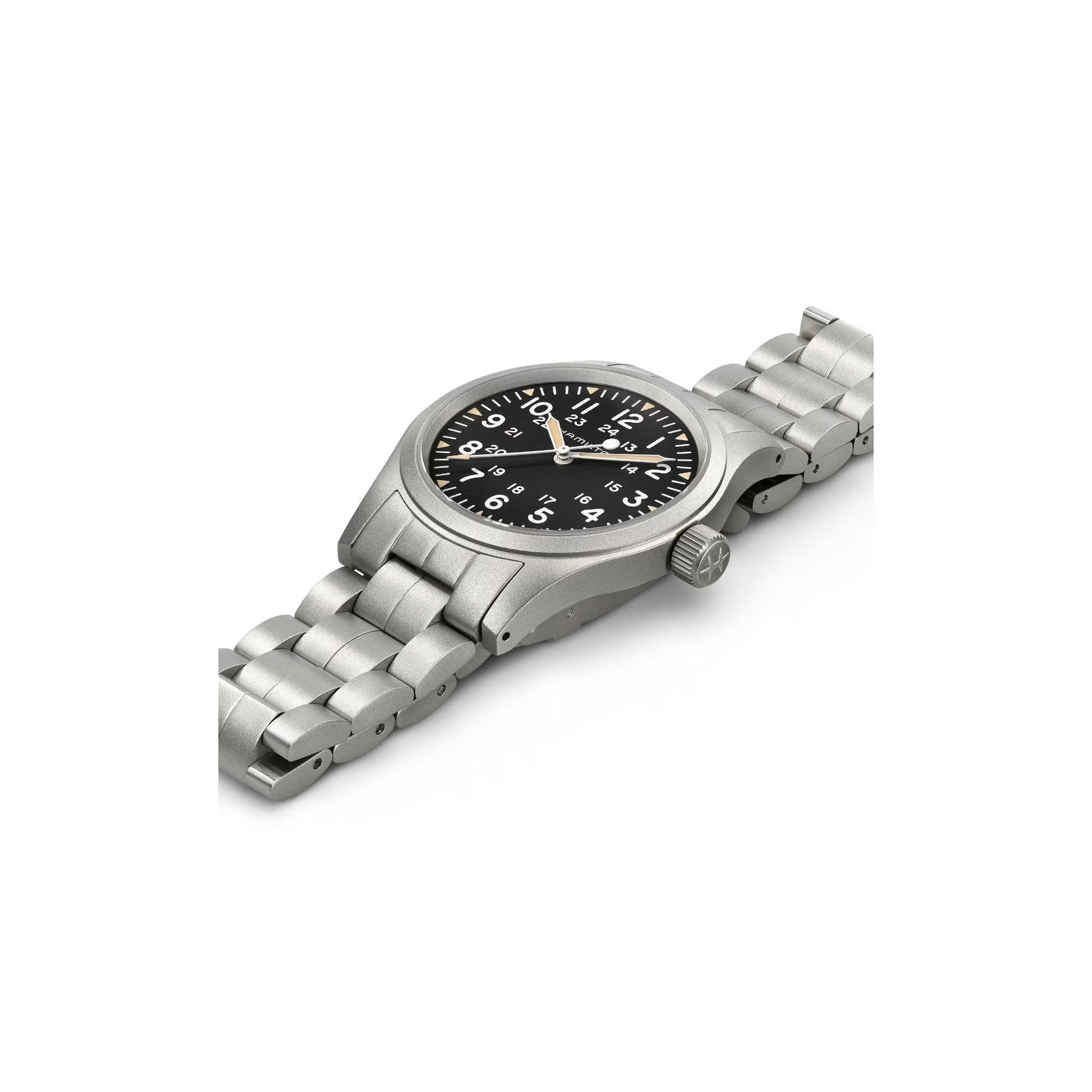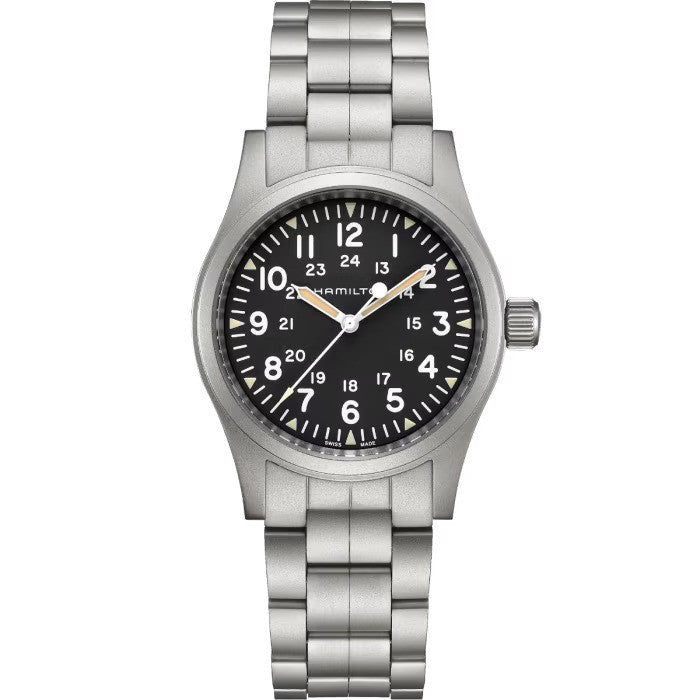 - The original soldier’s watch is sportier than ever with a comfortable stainless steel bracelet. Powered by our exclusive H-50 handwinding movement, our latest Khaki Field Mechanical style won’t let you down. Rugged and reliable, this 38mm field watch is ready for an adventure.
