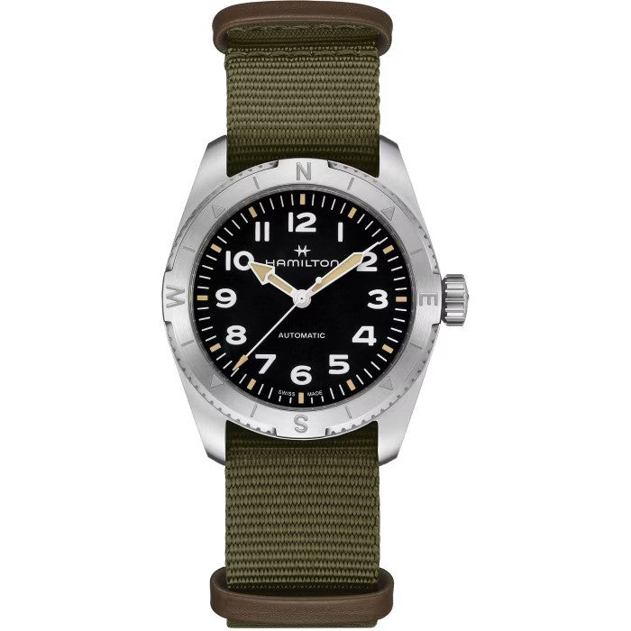- Gearing up for the great outdoors just got easier, thanks to the Khaki Field Expedition and its new NATO Strap. An all-terrain adventure watch with a compass design, enabling you to navigate your next excursion with the help of the sun. Housed in a 37mm stainless steel case and paired with a green NATO textile strap, it is equipped with a screw-down crown and a black sandblasted dial, making it your toughest timepiece yet.