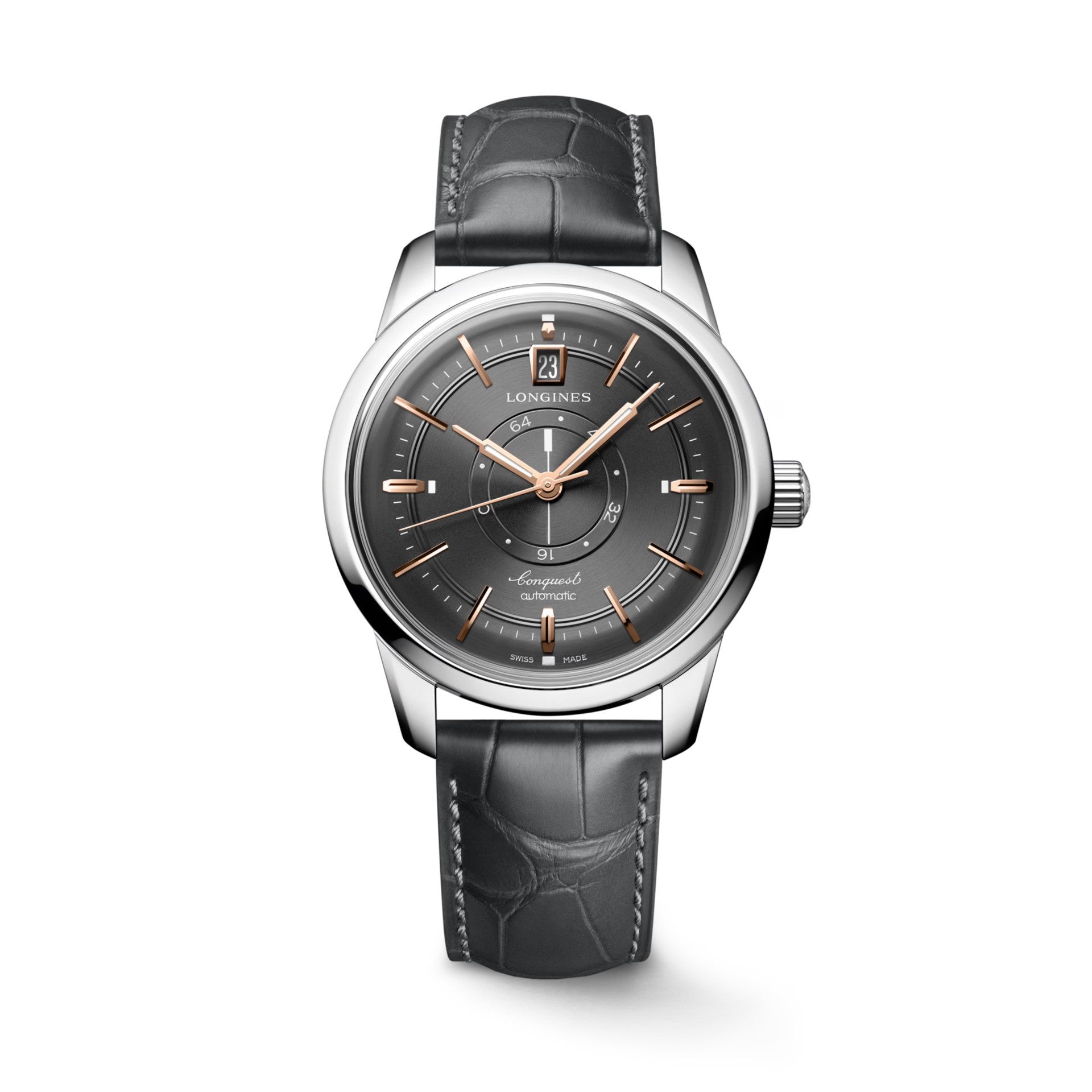 Longines is presenting the new CONQUEST HERITAGE CENTRAL POWER RESERVE in a 38 mm diameter case. Self-winding mechanical movement, exclusive Longines calibre L896.5 with power reserve on rotating discs in the centre of the dial. An iconic model revisited in a anthracite dial paired with an integrated anthracite alligator leather strap to mark the Conquest collection’s 70th anniversary.