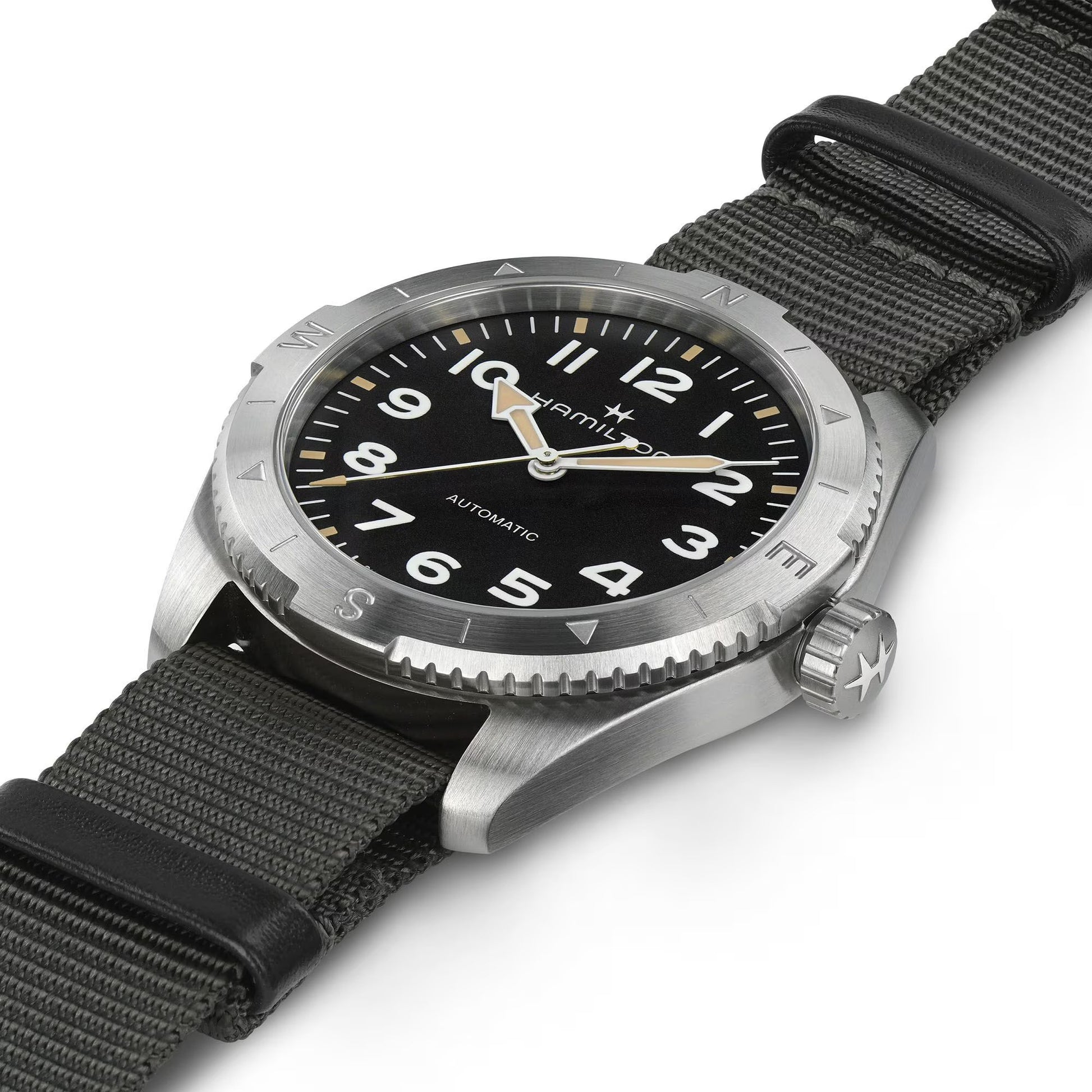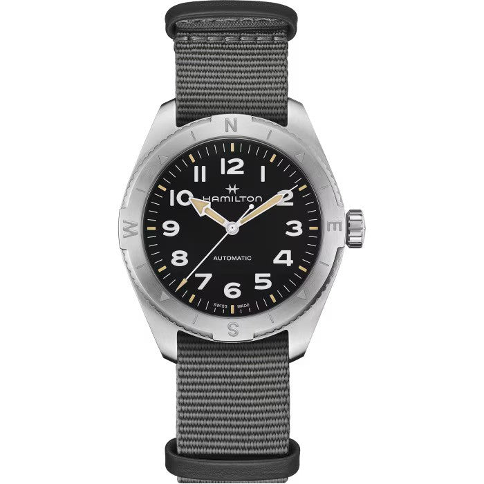 - Gearing up for the great outdoors just got easier, thanks to the Khaki Field Expedition and its new NATO Strap. An all-terrain adventure watch with a compass design, enabling you to navigate your next excursion with the help of the sun. Housed in a 41mm stainless steel case and paired with a grey NATO textile strap, it is equipped with a screw-down crown and a black sandblasted dial, making it your toughest timepiece yet.