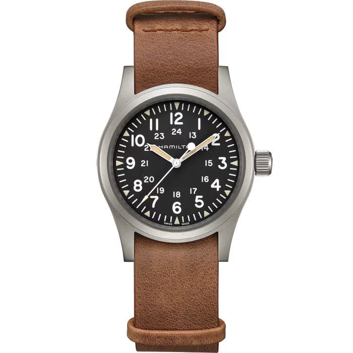 - 38 mm stainless steel case, three hand display, dark dial with light-colored numerals, triangular indexes with old radium color Super-LumiNova®, durable NATO strap: The new Khaki Field Mechanical is a faithful recreation of its original 1960s forebear and is true to Hamilton’s military heritage. The original soldier’s watch now features Hamilton’s unique ‘Earth’ colored PVD case coating. This Hamilton leather strap is made from natural materials. The leather is tanned, but has not been treated, pigmented and finished in the same way as some other leather straps. This helps it to retain its natural look and also means that every piece is not exactly the same. As a result, the color of the leather strap may differ from the color shown on the image. For more information, please contact your local authorized Hamilton retailer.