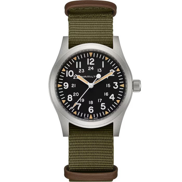 - One of Hamilton's most iconic timepieces is now available with a larger case size. Powered by our exclusive hand-wound H-50 movement, the Khaki Field Mechanical 42mm stays true to form with a sandblasted stainless steel case and ultra-readable dial in white or black. Whether you wear this updated version of the original soldier's watch with a comfortable stainless steel bracelet or green textile NATO strap, its rugged and resilient design will keep you on time through every adventure.