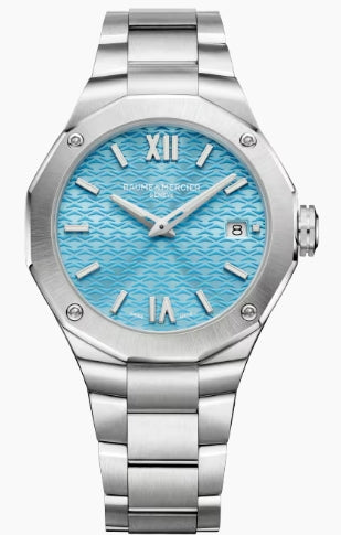 Driven by a “Swiss Made" quartz movement, this Riviera is adorned with an azure ...